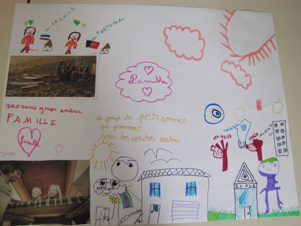 Les enfants ont d’abord semblé percevoir la famille comme une évidence. C’est très simple, il s’agit d’un groupe de personnes d’âges différents qui s’aiment et prennent soin les uns des autres. Puis ils ont introduit l’idée d’une hiérarchie dans ce groupe, les plus anciens étant écoutés, respectés des plus jeunes. Chacun y a un rôle dont celui de subvenir aux besoins des autres (plus jeunes), pour les anciens celui d’aider leurs descendants.