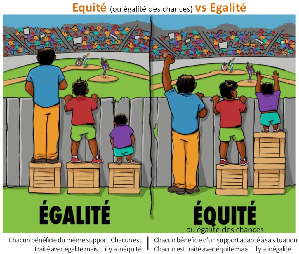 Cet outil devrait être présent dans tous les collèges pour donner toutes leurs chances aux élèves de réussir. Lors d’un atelier sur la différence, avec des enfants de CM2, nous avons parlé de la différence entre égalité et équité. Je leur ai présenté cette image :