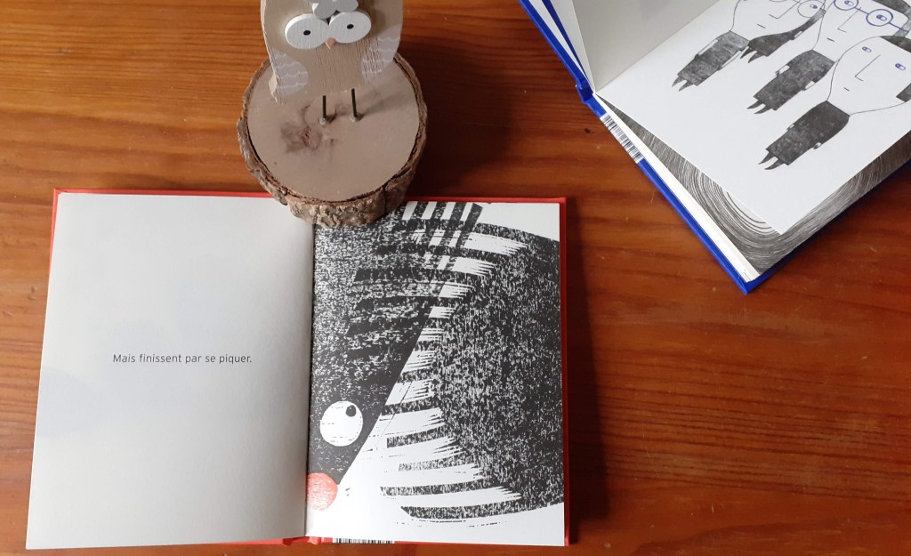 Le second est illustré par Csil de manière tout aussi épurée mais elle a utilisé la gravure et il nous invite à réfléchir à notre bonheur.