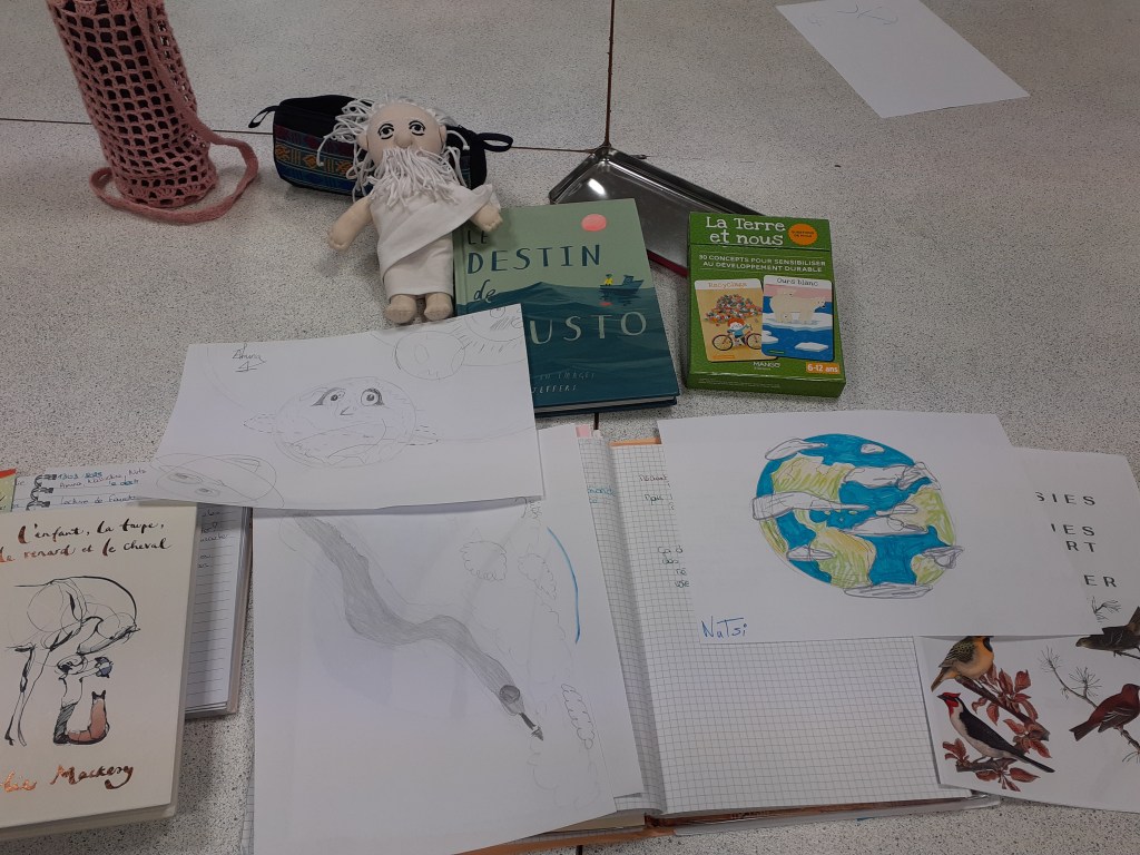 J’ai accompagné quasiment tous les sujets d’une lecture d’album et nous avons souvent terminé par une création : lettre à celle ou celui que je serai dans 15 ans, affiche collaborative pour la MQ, un pliage, des cartes de conseils pour bien vivre-ensemble ou d’autres sortes de composition sur le thème discuté.