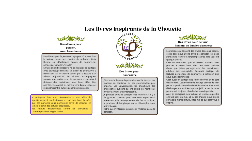 Je partage mes lectures depuis de nombreuses années, d’abord en tant que bibliothécaire puis en tant que simple lectrice. J’utilise les livres au quotidien pour mon plaisir, pour me former et pour enrichir mes ateliers philo, avec les enfants comme avec les adultes.